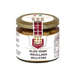 Lungo i pendii dell'Etna la fertile terra ci regala l'oliva verde “Nocellara dell'Etna”, il suo gusto prelibato fa'di questa conserva un prodotto unico. Le olive verdi si gustano in modo ideale con vino fresco oppure con birra ghiacciata e regalano una gradevole sensazione mediterranea.