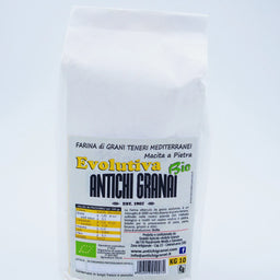 Farina evolutiva BIO, si tratta di un miscuglio di più di 2000 varietà di grano tenero mediterraneo, seminate sullo stesso terreno per anni, e ogni anno la natura seleziona le varietà più resistenti; così il campo di grano si aggancia alle variazioni climatiche, resistendo anche ad infestanti e malattie.