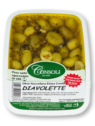 Olive Nocellara Etnea, olio extravergine di oliva 100% italiano, origano, prezzemolo, semi di finocchio, aglio e peperoncino.