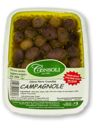 Olive Nere, olio extravergine di oliva 100% italiano, origano, prezzemolo.