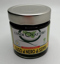Polpa di pomodoro, Seppie 15%, Olio extravergine di oliva, cipolla, concentrato di pomodoro, zucchero, vino bianco, sale, Nero di seppie 1,5%, pepe nero.