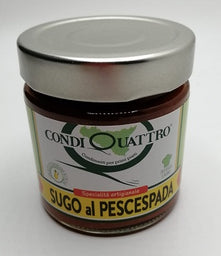 Polpa di pomodoro, Pescespada 12%, Olio extra vergine di oliva, vino bianco, zucchero, sale, prezzemolo, aglio, pepe.